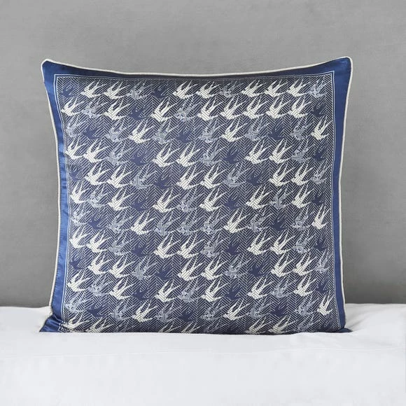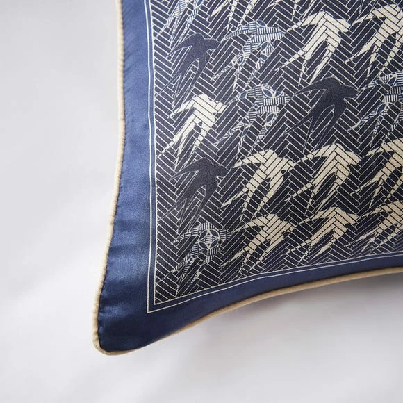 Boasting a beautiful swallow repeated printed pattern, with a classic herringbone pattern reverse this cushion would complement any bedding. Filled with feathers and printed on 100% silk fabric this cushion is durable and luxurious. This cushion coordinates well with the Bodhi bedding collection.