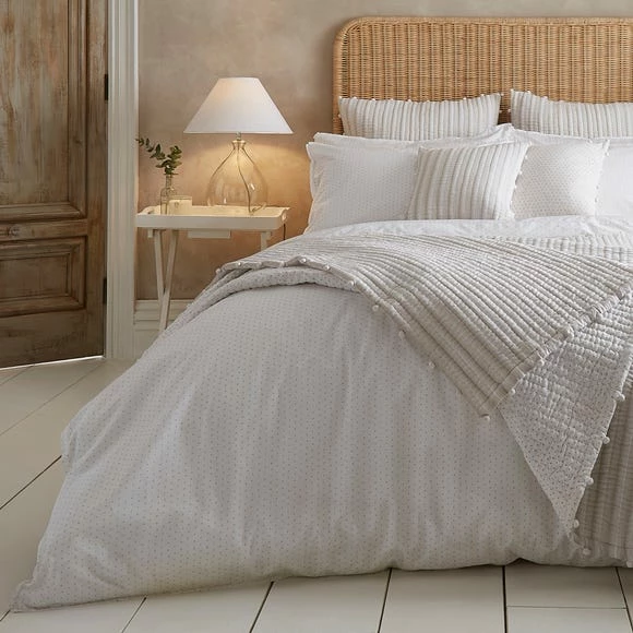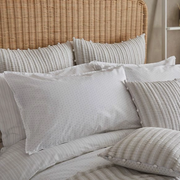 Boasting a dainty spot design combined with a delicate stripe pattern, printed on 300 thread count cotton percale fabric, and finished with a smart bias piping, this bedding set is ideal for adding a simple yet stylish touch to your bedroom. Layer this bedding with our super soft co-ordinating Coddington bedspreads, cushion, and pillow shams for a sumptuous finish. Extra pillowcases are also available.