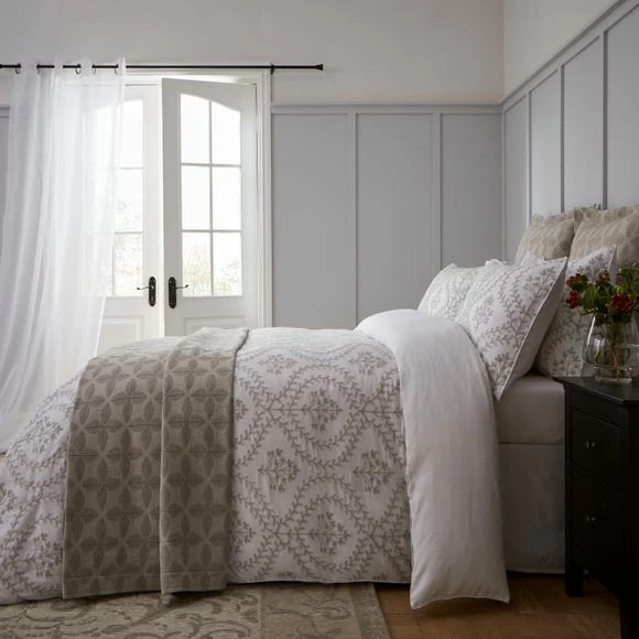 This Dorma Danbury has a simple yet versatile pattern that is inspired by iconic Arts and Crafts styles. The pattern is woven using a sumptuously soft 100% cotton jacquard that can be fully machine washed. Complete the look by pairing the bedspread with the coordinating Dorma Danbury continental pillowcase.