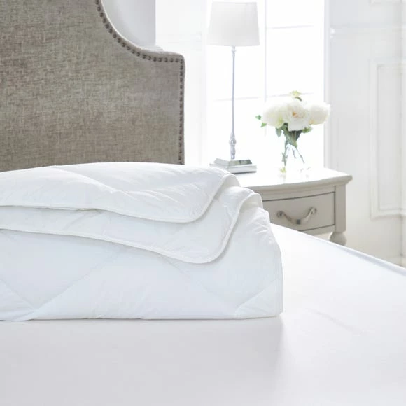 Crafted in the UK with a sumptuous 233 thread count, this 7.5 tog Dorma duvet stays fuller for longer thanks to the luxurious spiral fibre polyester filling which has a high quality feel. Its quilt stitch allows for even distribution of the deluxe filling and the bound edge finish adds extra durability. Covered with a crisp 100% cotton handle, this full forever duvet is ideal for those in between seasons. Machine washable, tumble dryer safe and available in a variety of sizes.