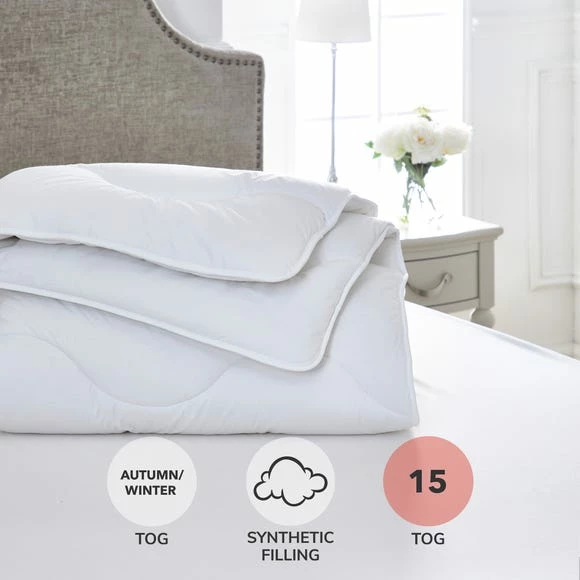 Perfect for providing extra warmth during the colder nights of the year, this 15 tog duvet from the premium Dorma range has a cosy spiral fibre polyester filling that will help to keep it fuller for longer and evenly distributed. This high quality 233 thread count duvet also features a sumptuous, crisp 100% cotton cover to provide maximum comfort all night long. Available in a choice of sizes and crafted in the UK, its anti-allergy properties make it ideal for allergy sufferers while it’s machine washable for easy care and cleanliness.