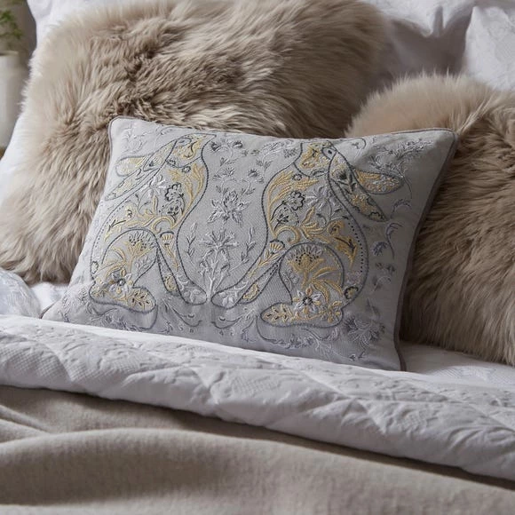 Featuring a charming mirror image of rabbits and an Arts and Crafts embroidered pattern this cushion boasts a nature-inspired design with a whimsical touch. Complete with velvet piping and a feather fill this cushion would look beautiful on any bedding.