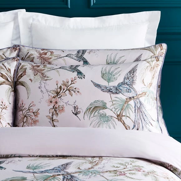 Adorned with beautiful florals and birds, our Dorma Lillian duvet cover set features gorgeous details which will give your bedroom a fresh uplift. The statement Lillian design is complemented by a dusky lilac colourway reverse, perfect for interchangeable styling where desired. Finished with a neatly piped edge, this duvet cover set is crafted from a 300 thread count cotton sateen that ensures nightly comfort. The duvet cover is then complete with a secure zipper closure that makes changing the covers easy.