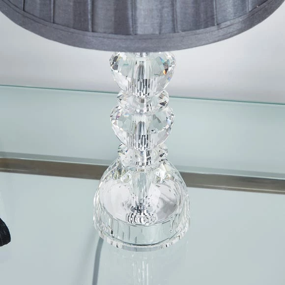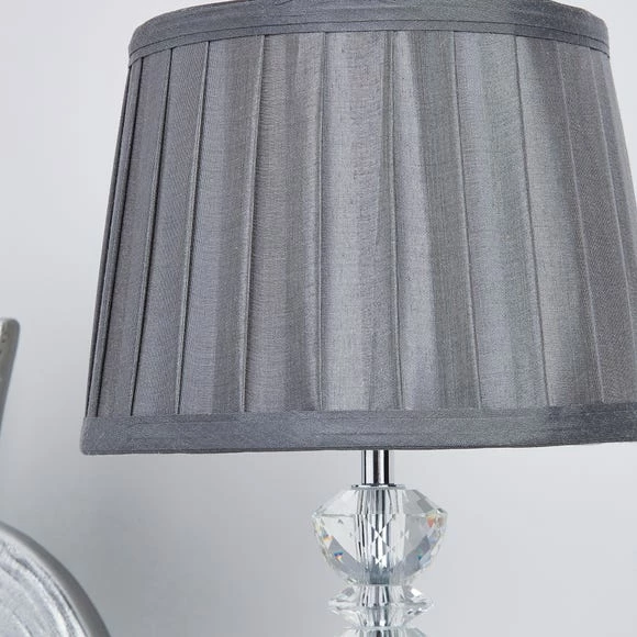 Give your decor a glamorous touch with this stunning Dorma Mini Genevieve table lamp. Exquisitely crafted with a clear, crystal base with a sleek chrome stem, this candlestick table lamp is finished with a grey pleated faux silk shade with a double taped trimmed detailed finish.