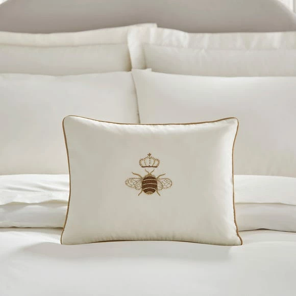 The ideal finishing touch to your favourite seat or sleep space, this regal bee cushion features a gold-toned piped edge with an elegant bee handcrafted in Indian Zardozi beaded embroidery. This technique is exclusive to a region in India. Done by hand thread is stitching into fine copper coils to create the beading.