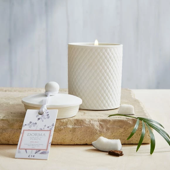 Part of the Dorma Purity range, this luxury fragranced candle has been developed by expert perfumers using only the finest natural oils and blended with soy wax. Escape to a tropical paradise with notes of bright orange, refreshing coconut and lemon. Like a warm ocean breeze, white flowers wrap around oceanic notes, vanilla and sandalwood, with a burn time of up to 40 hours. Each candle is beautifully packaged and contained within its own white porcelain lidded jar, featuring an exquisite cane embossed pattern which can be kept and reused as a decorative object, making this luxury candle truly unique.