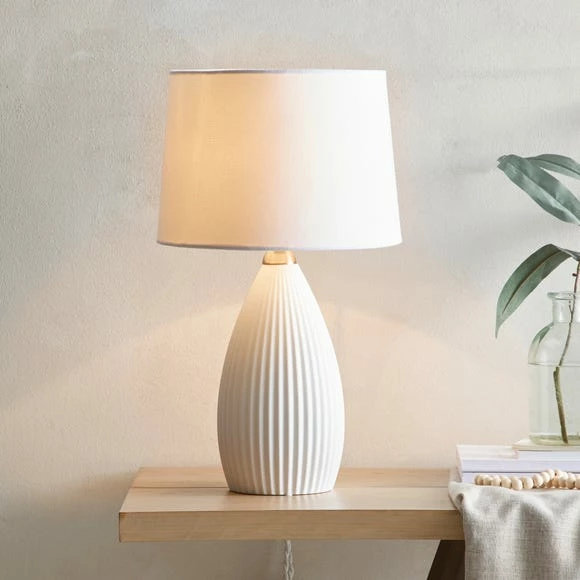 This stunning table lamp has a stylish textured ribbed design and modern porcelain colourway that complements an array of home decors beautifully. This piece is dual lit and part of the Dorma Purity collection, giving it a touch of luxury, as well as having matching family items available to complete the classy look. This lamp also has a 5-year guarantee.